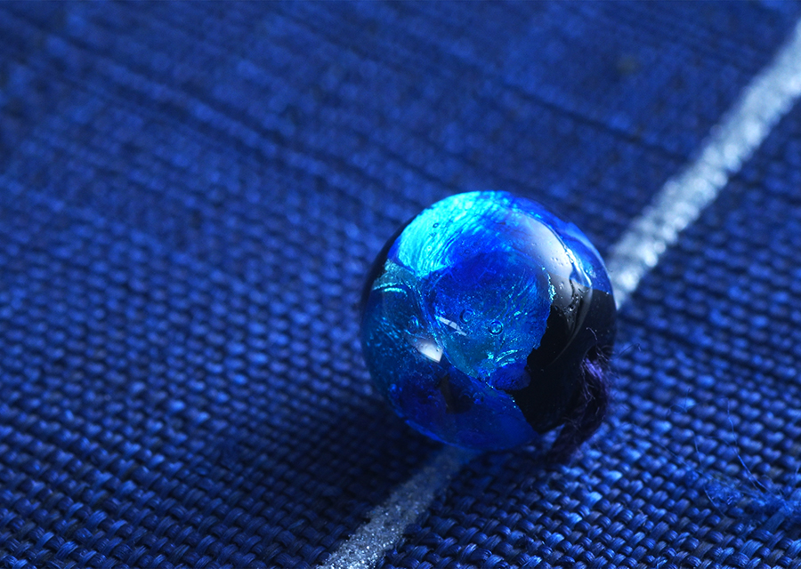 樹木の生い茂る森に降り注ぐ雨。そんな自然の営みを青緑の麻と翠玉のホタルガラスに重ねました。光る銀色のラインは快活さを感じさせるアクセント。ホタルガラスの輝きは地球の美しさを発信しています。